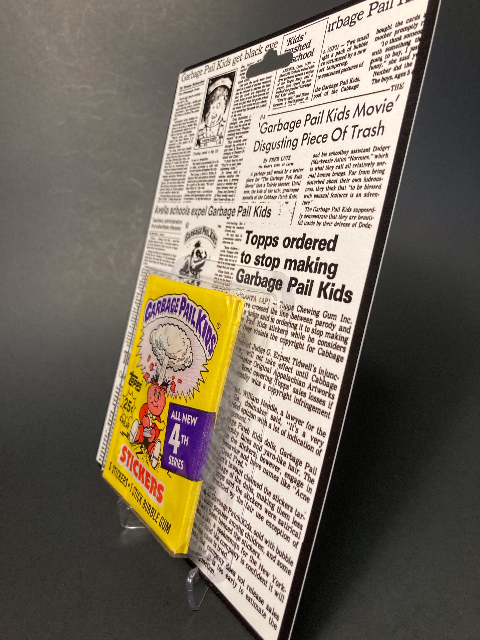 This piece includes an 8”x6” board with one original 1986 Garbage Pail Kids series wax packs attached. The board shows newspaper articles from the 1980s which discuss one of the most notorious legal battles between Topps, the makers of Garbage Pail Kids and the makers of Cabbage Patch Kids. To read the full articles visit GeePeeKay.com.